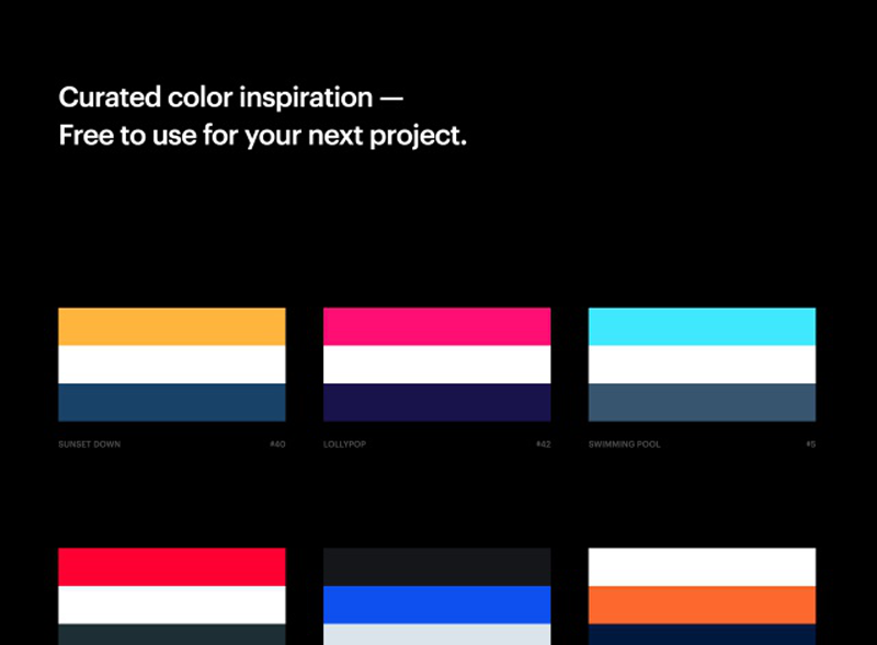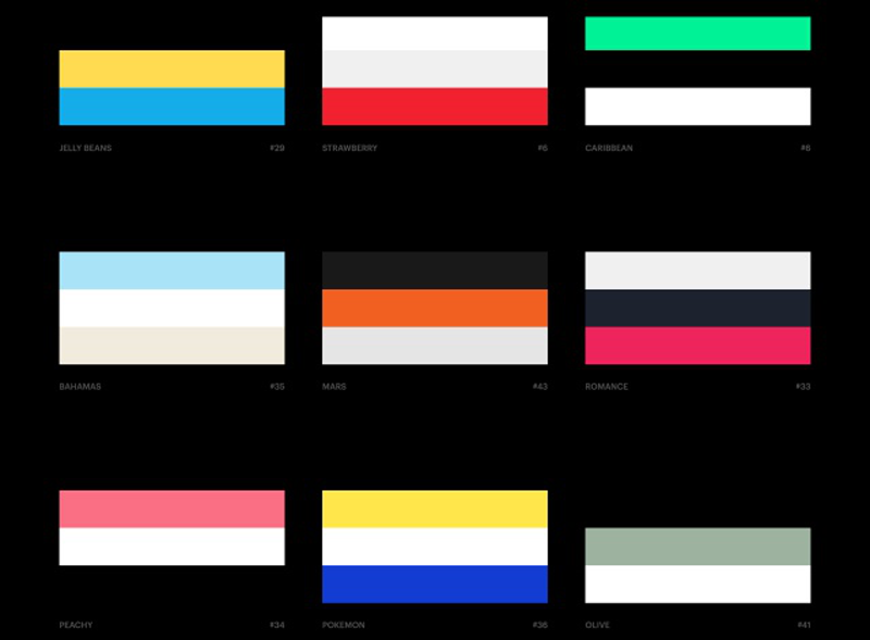 開啟 Colorinspire.io 網(wǎng)站后可以看到各個顏色組合,目前約有45 種,每一個組合都由三種顏色構(gòu)成,下方還會有配色名稱和編號。