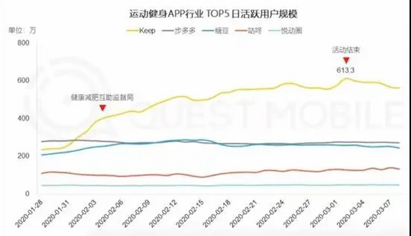而根據(jù)Questmobile的數(shù)據(jù),Keep的日活從200多萬(wàn)增長(zhǎng)到了最高613.3萬(wàn),增速極其明顯——這和它主打室內(nèi)運(yùn)動(dòng)的特點(diǎn)有直接關(guān)系,咕咚等以室外跑步的APP就沒有那么幸運(yùn)了。